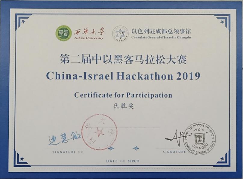 11月19日,第二届中以编程马拉松大赛暨“应急准备”中以专家圆桌论坛在西华大学举行。来自以色列本古里安大学、以色列应用科技大学、以色列赫兹利亚跨学科研究中心、Tel Hai学院13名计算机专业的学生与williamhill中国官方网站、西华大学、成都理工大学、成都工业学院、四川轻化工大学、宜宾学院的67名同学们联合组成16支队伍,围绕“应急准备”(Hacking the next crisis---Emergency Preparedness)主题进行编程马拉松比赛。我院刘皓然同学参加了此次大赛并以总分第5名的成绩获得优胜奖。