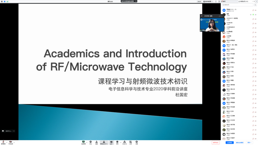 杜国宏教授为电子信息科学与技术专业的新生作了题为《Academics and Introduction of RF/Microwave Technology 》的学科前沿讲座,向新生清晰地讲解了电子信息科学与技术专业人才培养方案、人才培养模式、课程体系、创新意识和工程师能力、师资队伍、实验室平台等内容,高效且精准地让新生刷新对本专业的认识。杨智鹏副教授从专业办学历程、专业教师队伍、专业行业领域及趋势发展出发,为电子信息工程专业的新生开启专业教育,为新生详细解读了电子信息工程专业培养目标、课程体系等内容,并向新生全方位地介绍了电子信息工程专业应该怎么学。两位老师都希望同学们在今后的学习和生活中保持积极向上的心态,迎难而上,努力拼搏。