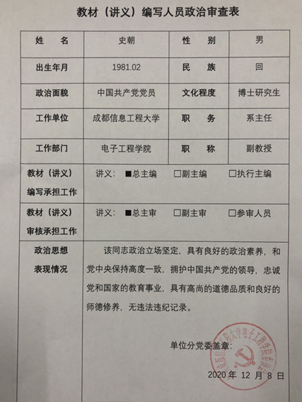 我院对史朝同志作为《Principle and System Meteorological Radar》教材自编讲义(参考资料,未出版)的编写人员开展了政治审查工作,经学院党政联席会议定,结论为“通过”。现就史朝同志的政治审查情况进行公示,公示期3个工作日,如有异议,请与williamhill中国官方网站办公室联系,联系电话:85966898。