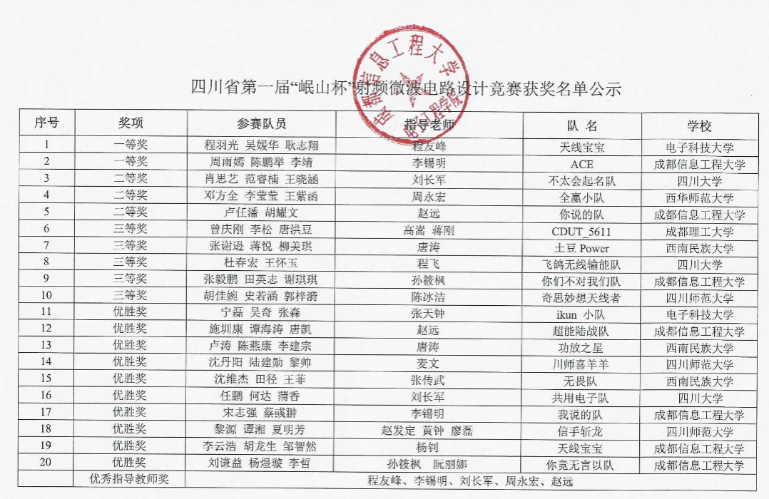 四川省第一届“岷山杯”射频微波电路设计竞赛决赛在我校圆满落幕。经决赛答辩和专家评议,本次竞赛最终评选出了一等奖2组,二等奖3组,三等奖5组,优胜奖10组,共计20支队伍获奖,优秀指导教师奖5名。现将获奖名单予以公示: