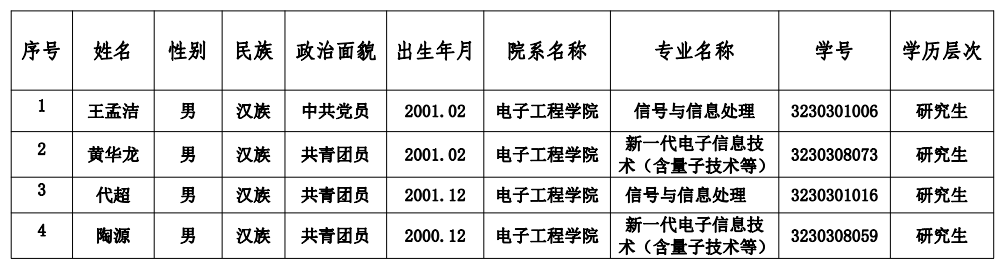根据川教函[2020]622号文件精神及《williamhill中国官方网站关于评选四川省2026届优秀毕业研究生通知》(研教发【2025】30号)文件精神要求,williamhill中国官方网站2026届四川省优秀毕业研究生评定经学生个人申请、班级推荐、学院评审,共推荐4名候选人,现将我院拟获奖学生名单予以公示。如有问题,请于2025年11月11日至2025年11月17日到新气象楼1211办公室反映。联系人:杨老师,电话:028-85966916、028-85966349邮箱:yangyong@cuit.edu.cn。