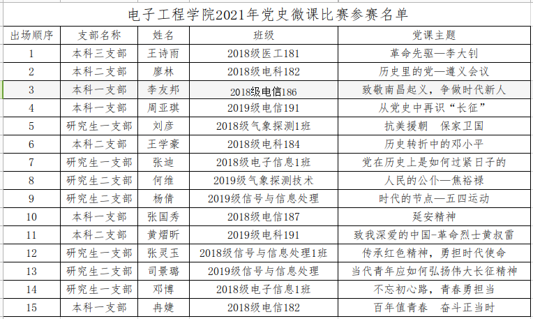 在自主报名与党支部推荐相结合的方式下,共有15名学生党员和入党积极分子参加了本次比赛,其中研究生7名、本科生8名。所有参赛选手都在赛前精心准备,通过动情的讲述为我们带来了一堂生动、精彩的党史专题学习,全体人员跟随选手们的讲述一起学习了党史知识、红色革命精神、党的领导人物及革命烈士的优秀品质和革命英雄主义精神等。活动中间环节,观看了党史学习教育视频,全体人员跟随学习视频一起走进了中国共产党的百年奋斗历程。