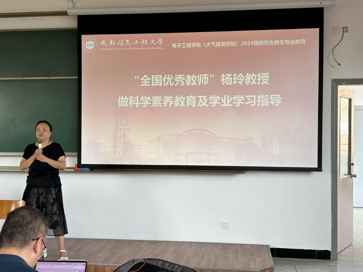 首先,“全国优秀教师”杨玲教授向同学们进行了科学素养教育及学业学习指导。她首先强调了终身学习和创新性的重要性,要沉下心来累积和提炼知识素材,积极思考,扩大交流,定期汇报、不断总结。希望同学们从进校开始就勤奋好学,有明确的方向和目标,努力把专业知识夯实。最后希望大家在三年后都能学有所成,成果丰硕。