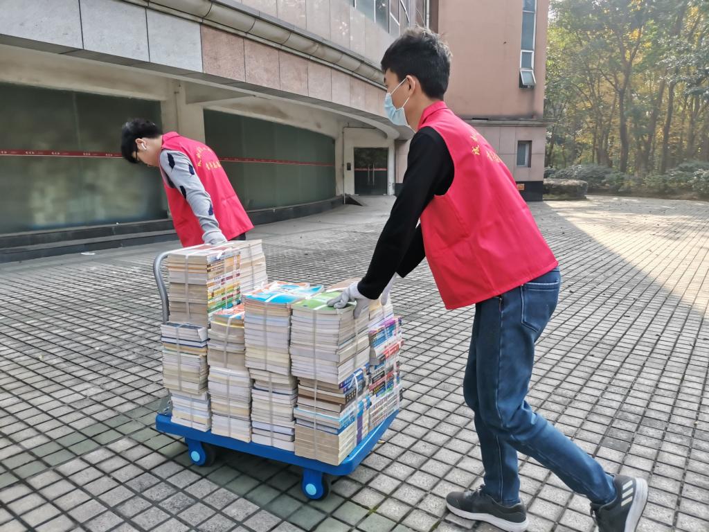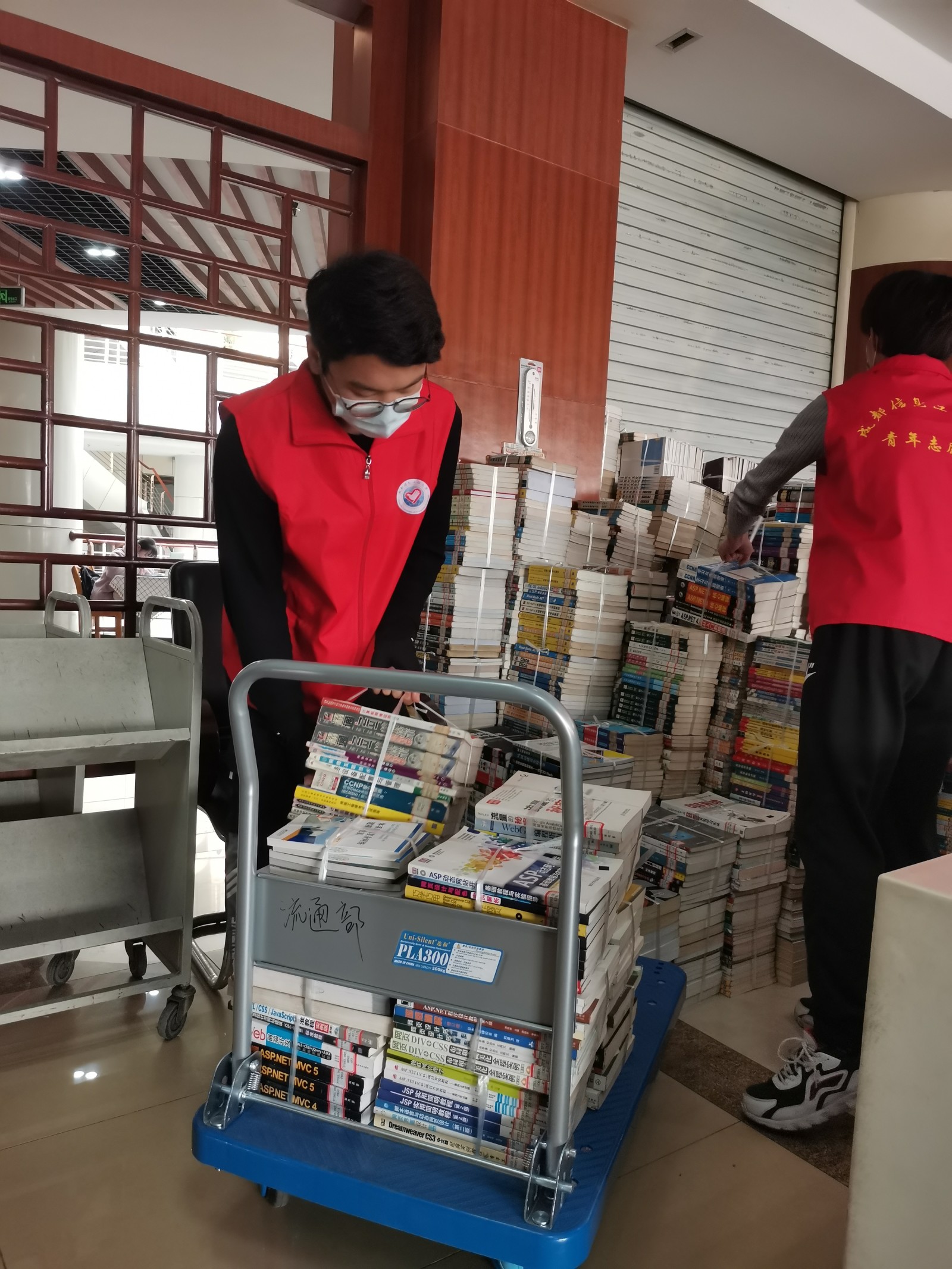 下午1点50,青志协的志愿者们准时在图书馆大门前集合。首先,了解了一系列的注意事项,比如:使用手推车时要注意声音的控制;放置书籍时也要轻拿轻放……随后,志愿者们穿上志愿服有条不紊的开展工作了。志愿者们两个人为一组,使用一辆手推车,并在仓库留下两名志愿者搬运搬下来的书籍。这可时间体力活呐!最开始时,由于大家有点不熟悉手推车的使用方法,结果在进电梯的时候还把放好的书弄倒了。但是,大家却越来越熟练了,一个小时就完成了将旧书籍搬运到图书馆底楼仓库的任务。随后,图书馆的工作人员又对志愿者们安排了新的任务:去图书馆一楼大厅,将在一楼大厅的四楼书籍搬运到四楼来。随后,志愿者们来到一楼,但书架上的书是没有整理过的,可给志愿者们增添了不少麻烦,但经过一段时间的熟悉,不一会的就完成了任务。在临走时图书馆的工作人员在表示感谢的同时,还希望更多的志愿者们能来帮忙。