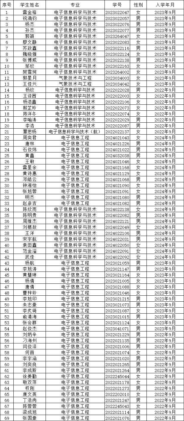 根据《成信学字〔2025〕7号 williamhill中国官方网站关于评定2025年本科生国家励志奖学金、国家助学金的通知》文件要求,2024-2025学年度国家励志奖学金评定经学生个人申请、资格审查、专业年级评议小组评议、辅导员审核、学院集体审议,共推荐69名候选人参评国家励志奖学金,现将名单予以公示。如有问题,请于2025年10月21日-2025年10月23日反馈。