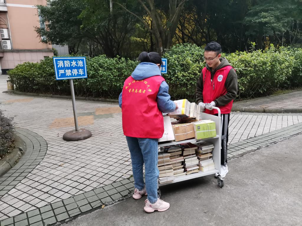 在进入图书馆前,志愿者们统一穿上志愿者服并仔细整理自己的着装。在活动中,志愿者们先跟着图书馆老师学习图书的捆绑打包方法。在学习完如何打包书籍过后,志愿者们便分工合作,女生负责将散乱摆放的书籍用绳子打包好,男生则负责将打包好的书籍用推车运送到图书馆负一楼保管室。在整理书籍的过程中,志愿者们合作默契,在两个小时的时间里就将堆成小山的书籍整齐地搬运并摆放在了图书馆负一楼保管室,既方便了同学们查找书籍,也为新书籍腾出了空间。