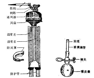 整套仪器由一对感应部分为柱状的温度表、支架、三通管及通风管组成,并附有专用直流稳压电源、双控开关和电缆。其作用原理和百叶箱中的干湿球温度表基本相同,所不同的是它采用电动通风装置,使流经湿球球部的空气速度恒定为(2.5m/s),以提高测定湿度的准确性。主要适用于测定空气的温度和相对湿度,产品特长是适合野外操作,是测量温度和湿度的二等测量标准。其构造如图所示。