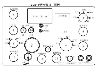 222-1型收信机是一款设计经典、质量上乘、结实耐用的收信设备。222-1型收信机的调谐度盘手动调谐感觉很好,108倍减速,多级分体无间隙齿轮传动、合适的旋转阻尼,又重又大的飞轮惯性可以达到快速调谐,令操作者感到厚重的力度。其面板图如图所示。