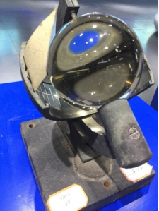 聚焦式日照计又称康培司托克式日照计,它由固定在弧型支架两端的实心玻璃球、金属槽(安装自记纸用)、纬度刻度尺和底座等构成。它是利用太阳经玻璃球聚焦后烧灼日照纸(卡片)留下的焦痕,来记录日照时数的。我国高纬度地区使用这种仪器。金属槽内有上、中、下三道沟:下面一道,插夏季(4月16日~8月31日)用的长弧型纸片;中间一道,插春、秋季(3月1日-4月15日,9月1日~0月15日)用的直型纸片;上面一道,插冬季(10月16日至次年2月底)用的短弧型纸片。放纸时,12时的时间线应与槽内中线对齐。