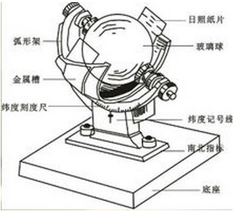 仪器由固定在弧型支架两端的实心玻璃球、金属槽(安装自记纸用)、纬度刻度尺和底座等构成(见图1)。其中实心球玻璃球支持在弧架两端支架上,整个弧架可以转动,以对准纬度。以玻璃球同心的金属槽,则是用以安放日照纸的,其半径恰好等于玻璃球的焦距。
