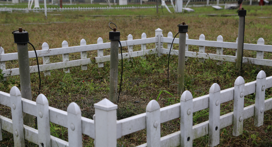 在观测场内南面标出一块地面有自然覆盖物(草皮或浅草层不长草的地区除外)面积为3×4平方米的范围作为深层地温的观测地段。地段的地面要与观测场其他地面一样平坦,若有洼陷应及时垫平和植上草层,草层应与观测场上草层同高。 直管地温表安装应自东向西由浅而深,表相隔约50cm,在地段中部排列成一行。应尽量采用钻孔法将直管地温表的套管垂直埋入土中。套管埋放后,要使各表感应部分中心距离地面的深度符合要求,并把管壁四周与土层之间的空隙用细土充填、捣紧。 为了保护地段的草层和有积雪时的积雪层,在地温表北边约30cm处,应设置一个木制观测台架。架宽约30cm,长度按观测方便而定,高度与地温表外管露出地面的高度相同。