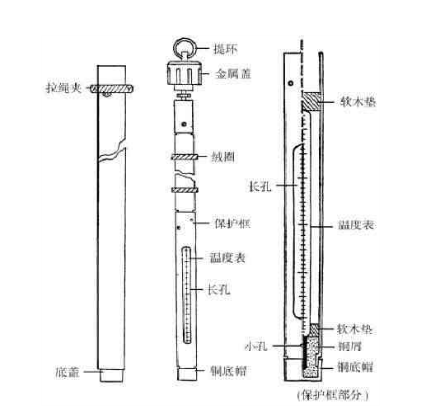 直管地温表是用于测量深层土壤温度的温度表。表装在带有铜底帽的管型保护框内,框中部有一长孔,使温度表刻度部分显露,便于读数。框顶端联以木棒,置于硬橡胶管内。套管垂直插入土中,深度分40、80、160、320cm等数种。
