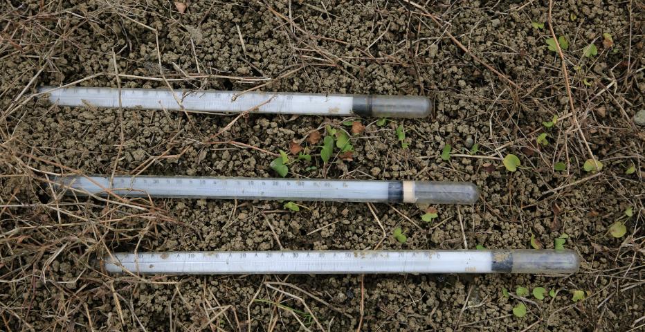 地面和浅层地温的观测地段,设在观测场内南面平整的裸地上,地段面积为2*4平方米。地表疏松、平整、无草,并与观测场整个地面平行。地面三只温度表须水平安放三只温度表须水平的安放在地段中央偏东的地面,按0cm、最低、最高的顺序自北向南平行排列,感应部件分向东,并使其位于南北的一条直线上,表间相隔约5cm;感应部分及表身,一半埋入土中,一半露出地面,如图1,埋入土中的感应部件与土壤必须密贴,不可留有空隙;露出地面部分的感应部分和表身,要保持干净。