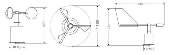 风速传感器采用传统三风杯结构,风杯选用碳纤维材料,强度高,启动好;风向传感器采用精密电位器,并选用低惯性轻金属风向标响应风向,动态特性好。杯体内置的信号处理单元可根据用户需求输出相应信号。风杯和风向标尾翼板用轻质高强度非金属材料制造。它的动态性能好、线性精度高、灵敏度高、测量范 围宽、互换性好、抗风强度大,电路抗雷电干扰能力强,寿命长、工作可靠。